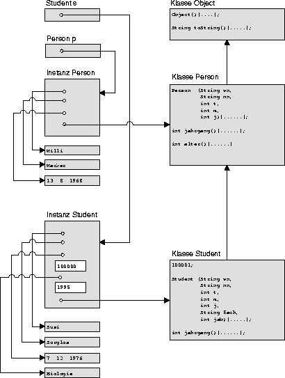 Die folgende Grafik verdeutlicht das Zusammenspiel zwischen den Klassen Person und Student und ihren Instanzen. Auf dem Laufzeitkeller führt von der Variable s ein Verweis auf die Speicherfläche, welche eine Instanz vom Typ Student aufnimmt. Da einige Bestandteile von Student (nämlich vorname, nachname, geb_datum und fach) selbst wieder Objekte sind, führen dorthin weitere Verweise; die Instanzvariablen matr_nr und jsb werden hingegen explizit gespeichert. Ein weiterer Verweis (gezeichnet von links nach rechts) führt zu den Klassenvariablen und Klassenmethoden; von dort sind die Oberklassen erreichbar, von denen geerbt wurde.
