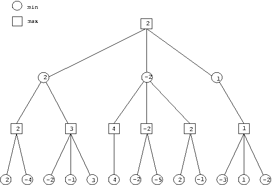 Typischerweise werden die Knoten eines Spielbaums dynamisch während des Spielverlaufs erzeugt. In einem Zwei-Personen-Spiel mit den Spielern Schwarz und Weiß möge ein numerischer Wert die Qualität einer Stellung bezeichnen: positive Werte seien vorteilhaft für Schwarz (der bei den MAX-Knoten am Zuge ist), negative Werte seien vorteilhaft für Weiß (der bei den MIN-Knoten am Zuge ist). Die Entscheidung, ob ein Knoten als Blatt betrachtet wird, hängt von der Spielstellung und auch von der verfügbaren Rechenzeit ab. Wir setzen folgende Klasse voraus: