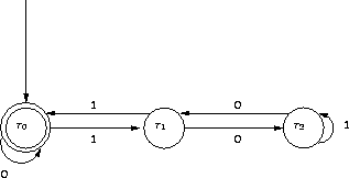 Dazu gehört ein Zustandsüberführungsgraph mit den Knoten $r_0$, $r_1$ und $r_2$, welche die Zustände beschreiben, wenn für den bislang eingelesenen String die Division durch 3 den Rest 0, 1 bzw. 2 ergibt. An der Kante steht das jeweils nächste Bit der Dualzahl, die von links nach rechts abgearbeitet wird.