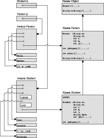 Die folgende Grafik verdeutlicht das Zusammenspiel zwischen den Klassen Person und Student und ihren Instanzen. Auf dem Laufzeitkeller führt von der Variable s ein Verweis auf die Speicherfläche, welche eine Instanz vom Typ Student aufnimmt. Da einige Bestandteile von Student (nämlich vorname, nachname, geb_datum und fach) selbst wieder Objekte sind, führen dorthin weitere Verweise; die Instanzvariablen matr_nr und jsb werden hingegen explizit gespeichert. Ein weiterer Verweis (gezeichnet von links nach rechts) führt zu den Klassenvariablen und Klassenmethoden; von dort sind die Oberklassen erreichbar, von denen geerbt wurde.