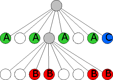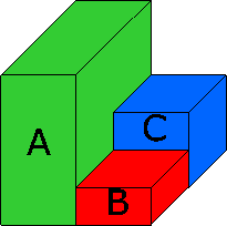 Abbildung 16.12 zeigt die Platzierung von drei Würfeln A,B,C im Raum. Der zugehörige Octree teilt rekursiv den repräsentierten Raum in 8 Oktanten ein und notiert an einem Knoten, ob er nichts enthält (weiss), teilweise Objekte enthält (grau) oder einen Quader repräsentiert (farbig).