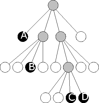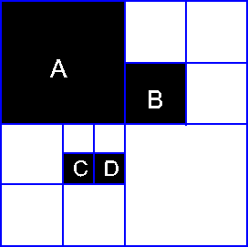 Abbildung 16.12 zeigt die Platzierung von 4 schwarzen Rechtecken A,B,C,D in der Ebene. Der zugehörige Quadtree teilt rekursiv die repräsentierte Fläche in 4 Quadranten ein und notiert an den Knoten, ob er nichts enthält (weiss), teilweise Objekte enthält (grau) oder ein Rechteck repräsentiert (schwarz).