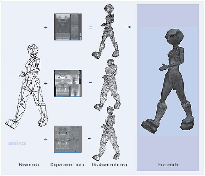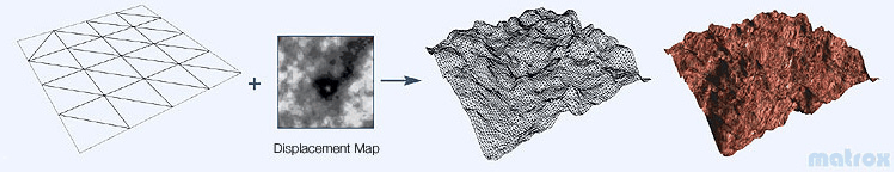 Das Displacement Mapping fällt etwas aus dem Rahmen der anderen Techniken heraus, denn es modifiziert nicht das Erscheinungsbild der Fläche, sondern ihre Geometrie. Dies geschieht, um die Größe der Datei mit der Szenenbeschreibung klein zu halten. Als Basis dient ein Körper mit geringer Flächenanzahl. Jede Fläche des Körpers wird anhand der Displacement Map in mehrere kleine Flächen unterteilt. Dabei können die neuen Punkte nur entlang der Flächennormalen verschoben werden. Sie werden also entweder aus der Fläche herausgehoben oder in die Fläche hineingeschoben. Die Stärke der Verschiebung ist in der Displacement Map als Grauwert hinterlegt. Diese Technik eignet sich besonders gut, um Landschaften kompakt zu beschreiben (analog zu ''Elevation Grid'' von X3D) oder um verschiedene Geometrien auf Basis eines Grundkörpers zu definieren.