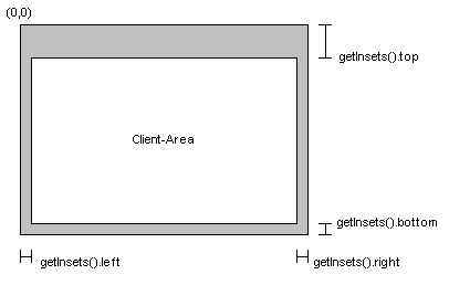 Man kann an diesem Beispiel gut sehen, wie die Größe der Client-Area ermittelt werden kann. Zunächst wird durch Aufruf von getSize die Größe des gesamten Fensters bestimmt. Anschließend werden die Teile des Fensters herausgerechnet, die nicht der Client-Area zur Verfügung stehen, nämlich der Rahmen und die Titelzeile. Auf diese Informationen kann mit Hilfe der Methode getInsets zugegriffen werden. Sie gibt die Abmessungen der Elemente an, die um die Client-Area herum plaziert sind.