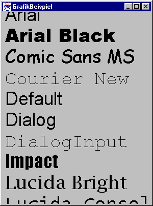 Diese Methode liefert ein Array von Strings mit den Namen der Standardschriftarten, die in der vorliegenden AWT-Implementierung verfügbar sind.