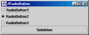 Das folgende Programm enthält drei Radiobuttons, die über eine ButtonGroup gruppiert werden. Der zusätzliche Button "Selektion" ermittelt das selektierte Element und gibt dessen Kommandonamen auf der Konsole aus: