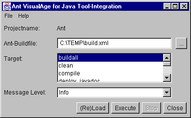 Visual Age for Java is a great Java IDE, but it lacks decent build support; for creating deliveries. On the other hand, Ant supports the build process very good, but is (at least at the moment) command line based. So we decided to write some tasks to access the VAJ repository and a small visual Ant frontend to make running Ant from VAJ possible. We use the Tool API to integrate Ant in VisualAge for Java. In combination with the VAJ tasks (vajload, vajexport, vajimport) you can load defined versions of projects into your workspace, export the source code, compile it with an external compiler and build a jar without leaving the IDE. Of course compile messages are viewed in a logging window. Concluding: This tool provides decent deployment support VAJ has not (out of the box).