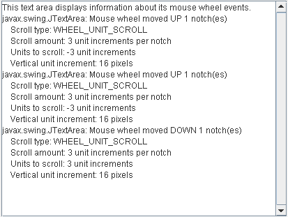 The output from MouseWheelEventDemo for a system that uses unit increments for its mouse wheel might look as follows: