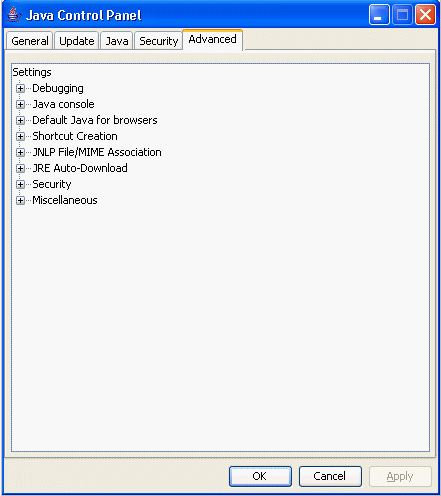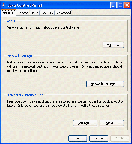 The Java Control Panel is a multipurpose control panel. It allows you to view and set a wide range of parameters controlling how Java runs on your computer. It lets you view and delete temporary files used for Java Plug-in, which allows Sun Java to be used by your web browser to run applets, and Java Web Start, which allows you to run Java applications over the network. It allows you to control certificates, making it safe to run applets and applications over the network. It allows you to set runtime parameters for applets run with Java Plug-in and applications run with Java Web Start. It provides a mechanism for updating your version of Java so that you always have the latest. And it allows you to set options for debugging, desktop integration, applet handling, etc. The Java Control Panel includes the following separately viewable panels: