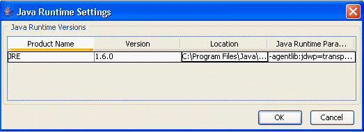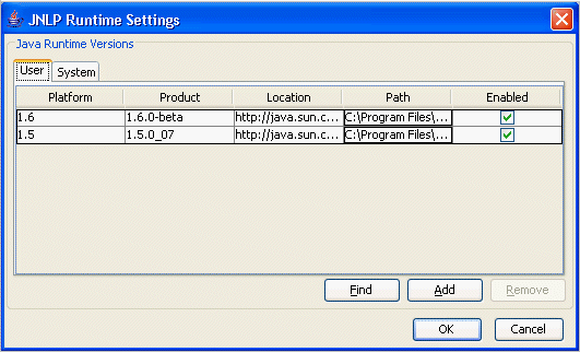 NotesThere will always be at least one entry. It will be the most recently installed JRE; i.e., the JRE associated with the Java Control Panel. Windows will show all JREs installed on a computer. The Java Control Panel finds the JREs by looking in the registry. On Unix the situation is different. There is no registry so there is no easy way to find the JREs that a user may have installed. Thus, for Unix there are Add and Remove buttons. For Unix, only version 5.0 or higher should be added. For Windows, where all JREs are found in the registry, only version 5.0 or higher will be displayed. Example:Assume you are running on Microsoft Windows with Microsoft Internet Explorer, have first installed version 1.4.2, then version 5.0, and you want to run 1.4.2.