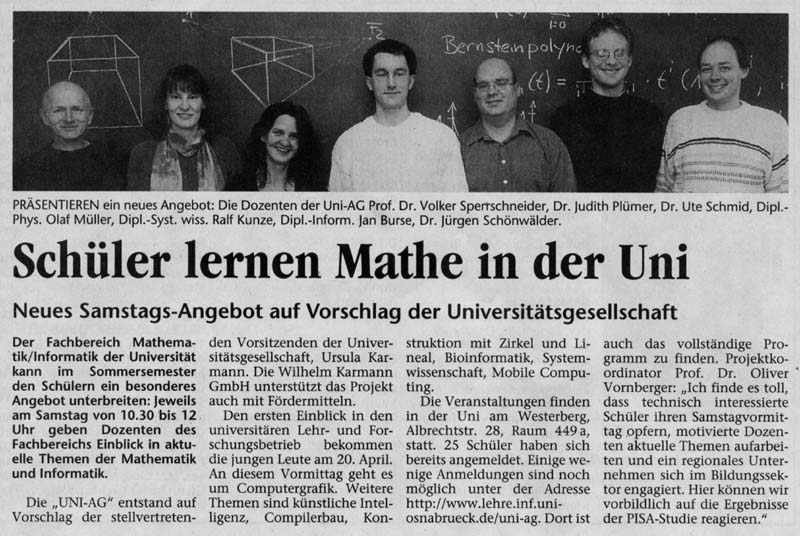 Interessenten schicken bitte eine Anmeldung per email an den Koordinator der UNI-AG, Oliver Vornberger (oliver@uos.de) unter Nennung folgender Angaben: